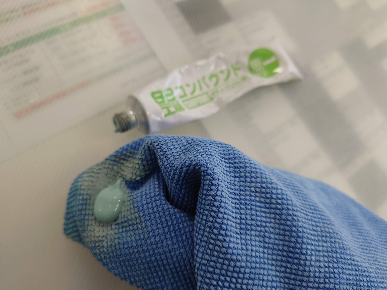 左は、クルマのワックスのメーカーとのイメージが強い「SOFT99」の、コンパウンドトライアルセット、の細目→中細→極細3種類中の〝細目〟です。